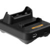 De lader kan aangesloten worden op / via een stopcontact en beschikt over verschillende veiligheids- en beveiligingsfuncties om ervoor te zorgen dat uw portofoon veilig kan worden opgeladen. Ook is er een mogelijkheid om een tweede accu op te laden in dit station!